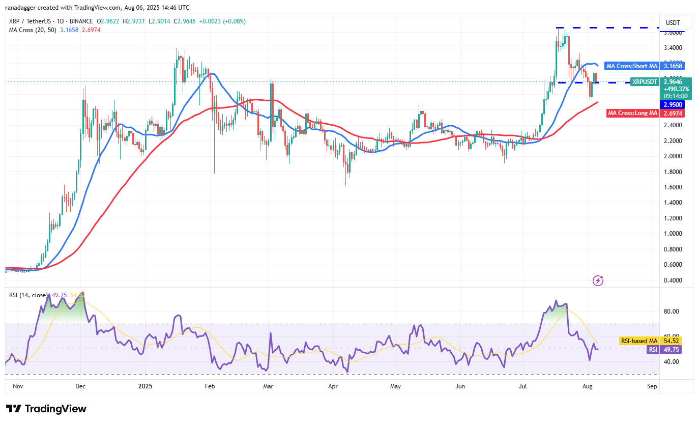 XRP (XRP) turned up from the 50-day SMA ($2.69) on Sunday but is facing selling near the 20-day SMA ($3.16).