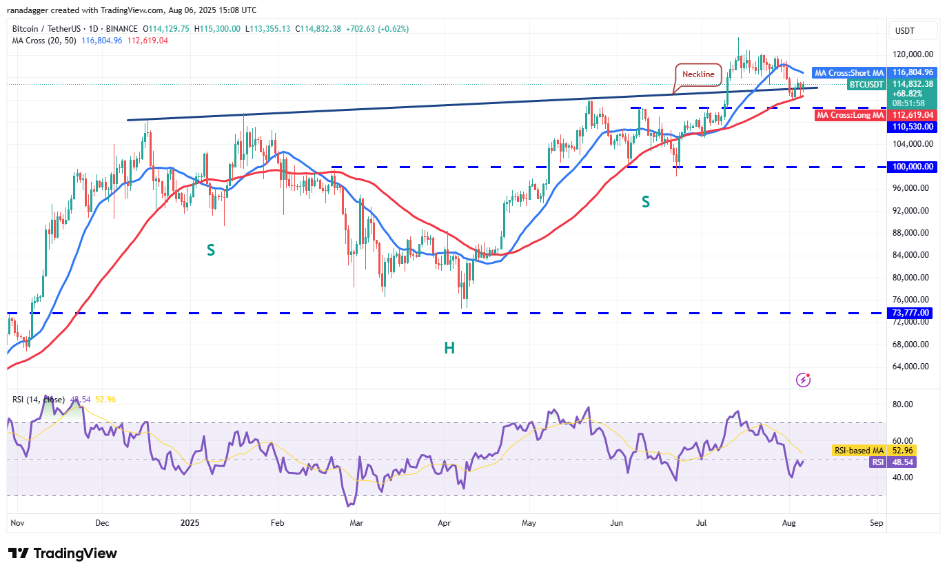 On Tuesday, BTC bounced off the 50-day simple moving average (SMA) ($112,619), indicating that the bulls are vigorously defending the level.
