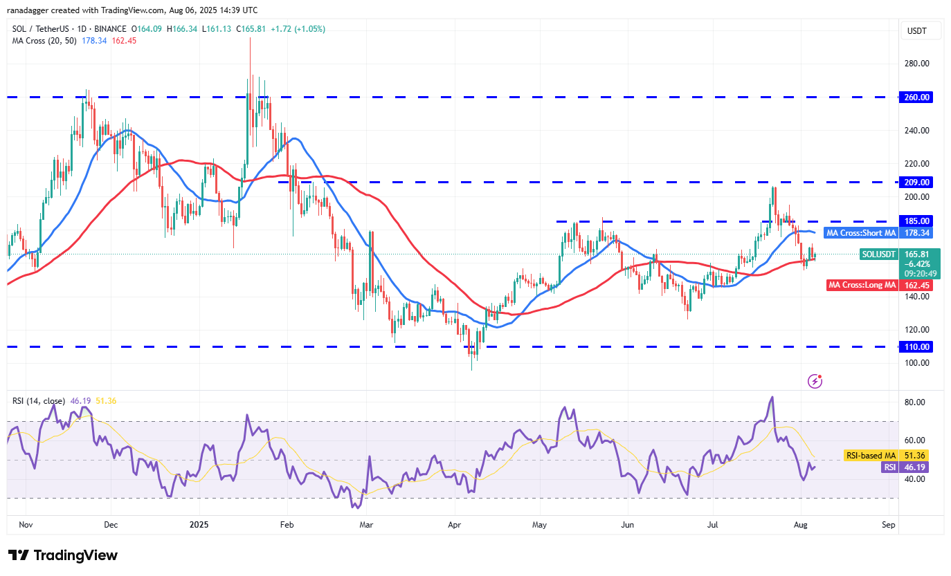 The flattish moving averages and the RSI just below the midpoint do not give a clear advantage either to the bulls or the bears. If the price rebounds off the 50-day SMA with strength, the SOL/USDT pair could rise to the 20-day SMA ($178).