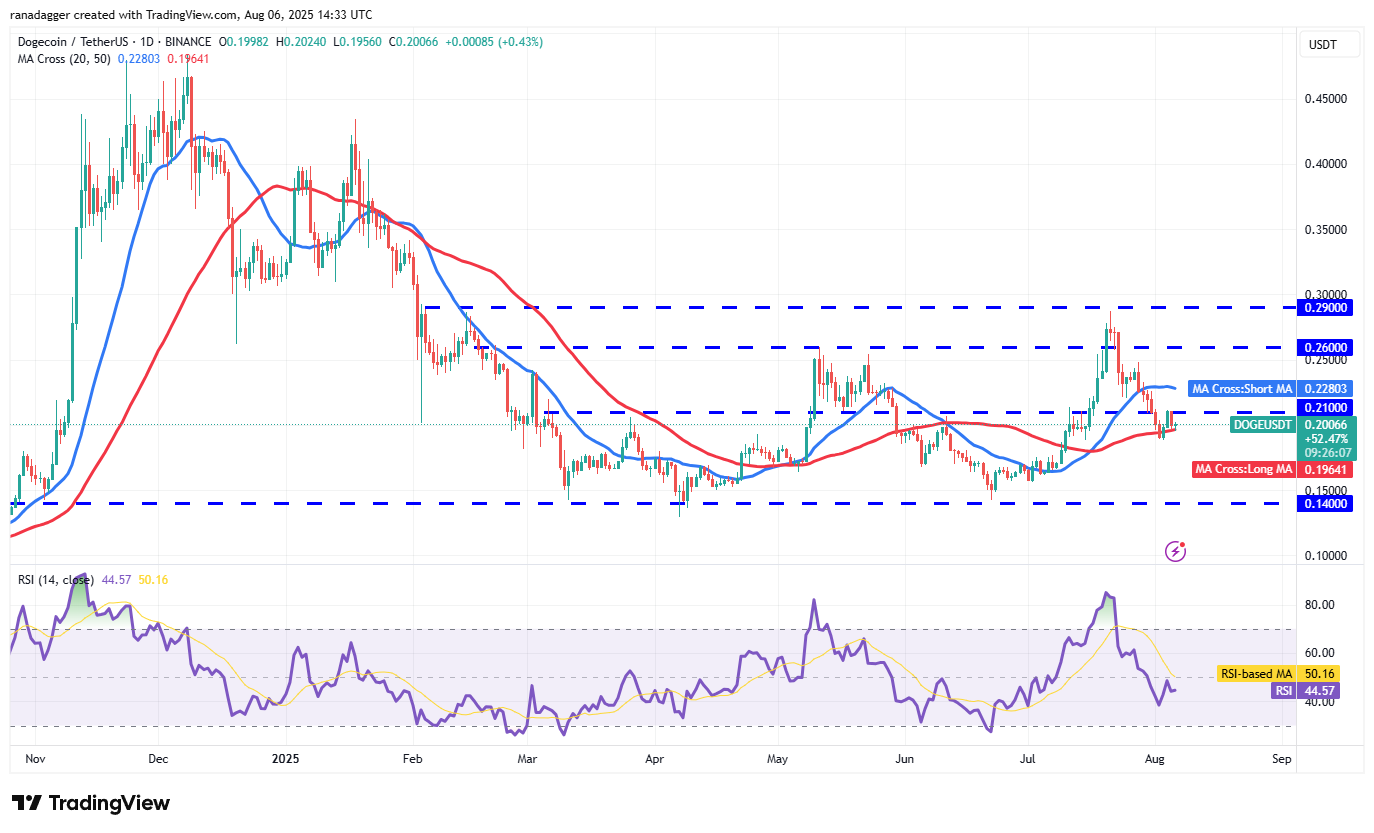 Buyers have managed to defend the 50-day SMA ($0.19) but are struggling to push Dogecoin (DOGE) above the $0.21 resistance.