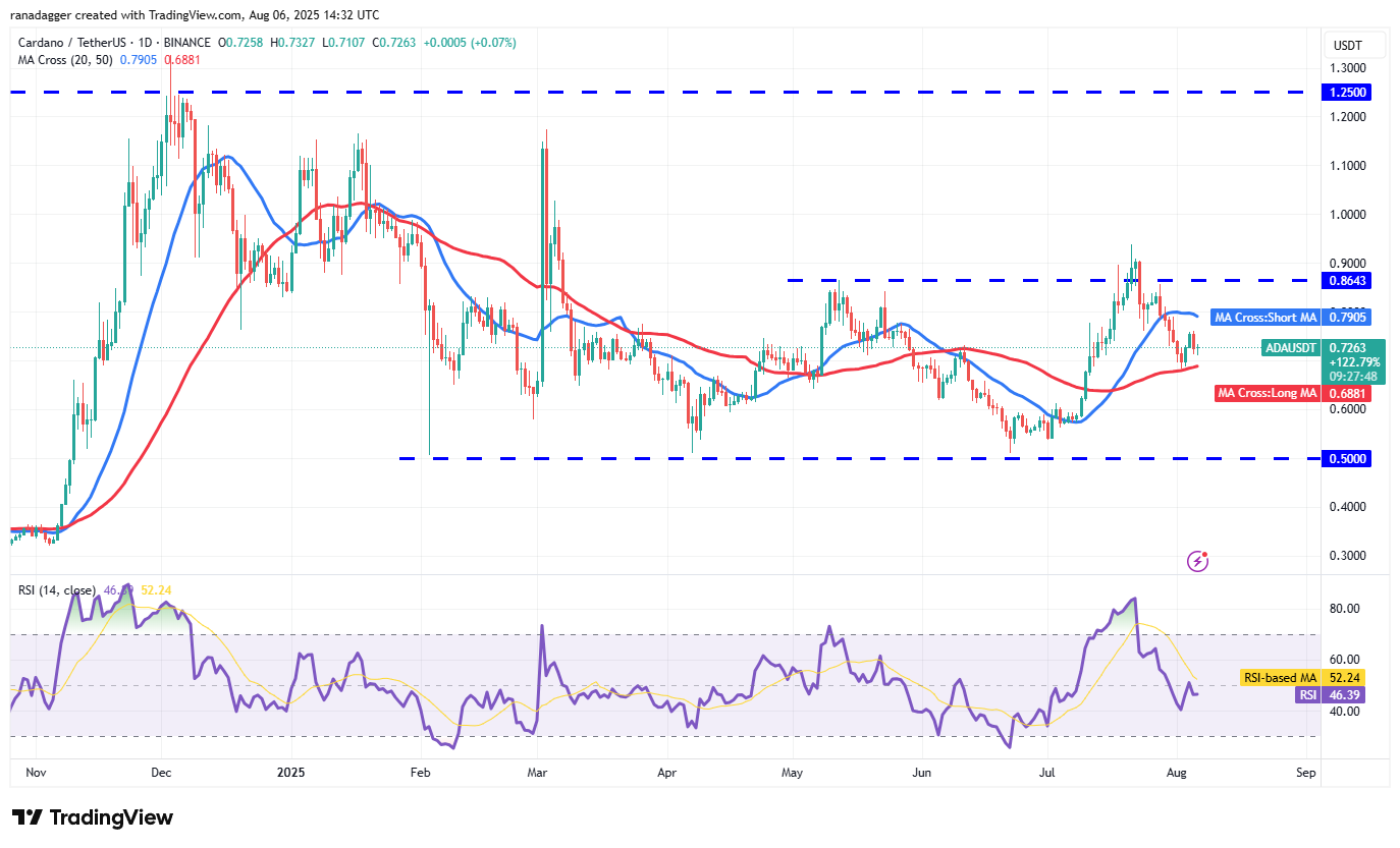 Cardano (ADA) bounced off the 50-day SMA ($0.68) on Sunday, but the relief rally is facing selling at $0.76.