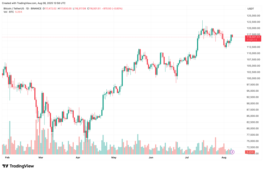 After hitting a recent low around $111,800, BTC has recovered part of its losses and is now trading near $116,500. Still, some analysts caution investors against “excessive optimism.” At press time, BTC was trading at $116,501, up 0.2% over the past 24 hours.