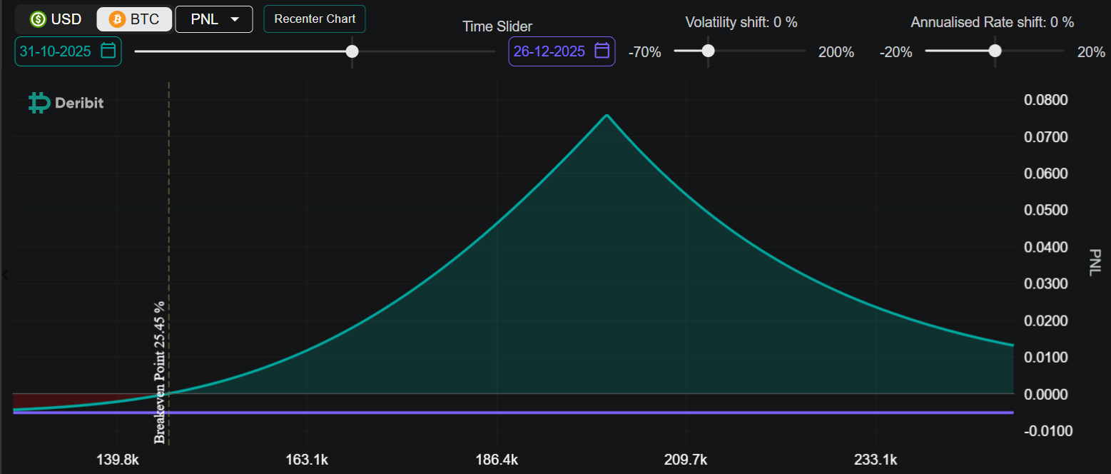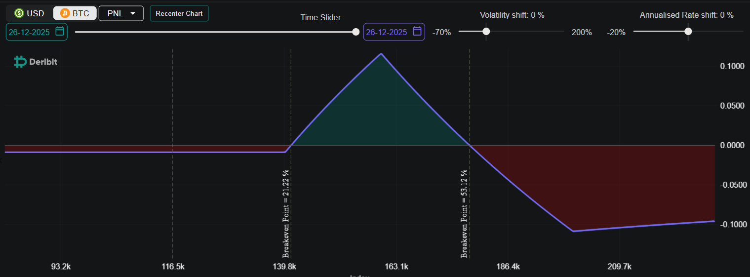 This position profits most if BTC lands near $160,000 on Dec. 26, netting BTC 0.112 (around $13,050). However, losses begin to accrue if BTC climbs past $178,500. Even so, the $200,000 call helps cap potential losses. In this case, the maximum loss is 0.109 BTC, or approximately $12,700.