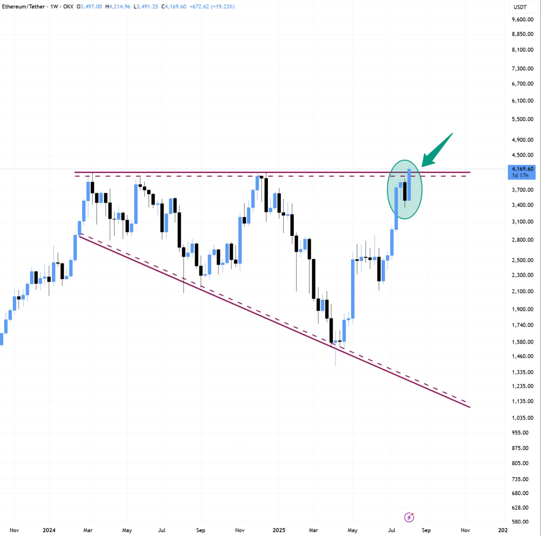 The last tap of the upper trend line marked Ether’s latest all-time high of $4,875, which it set back in November 2021.
