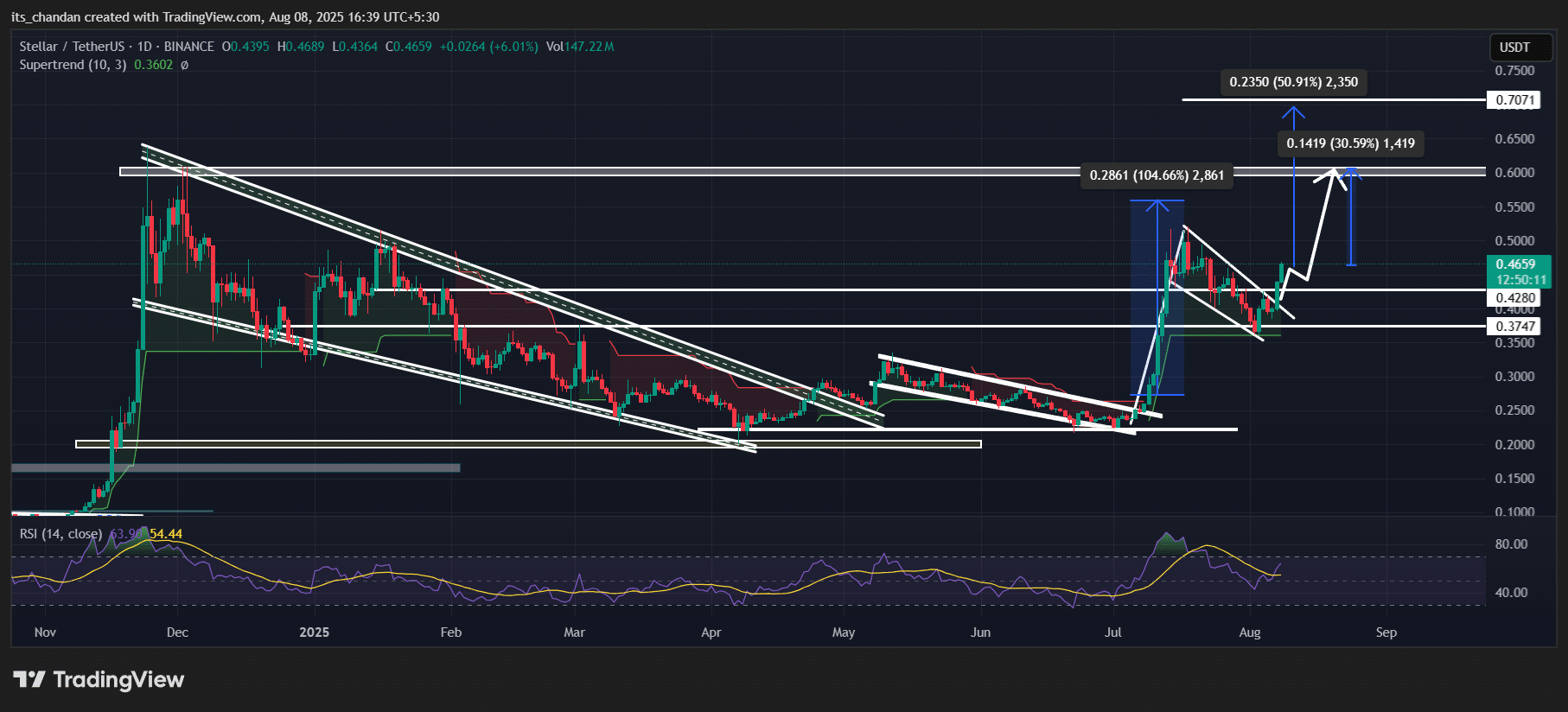 At the time of writing, XLM surged 15.25%over the past 24 hours, and reached $0.4610 level. This rally has attracted massive trader and investor participation, resulting in a 292% surge in trading volume compared to the previous day.
