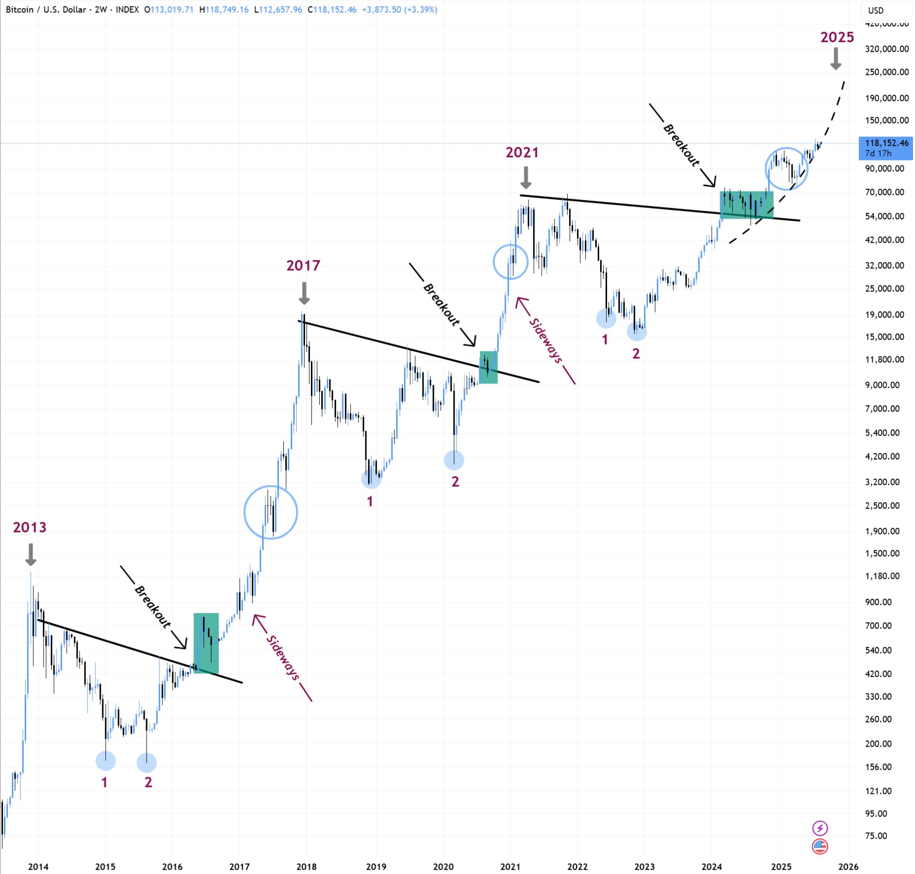 An accompanying chart compared BTC/USD now to previous bull markets to support the breakout thesis.