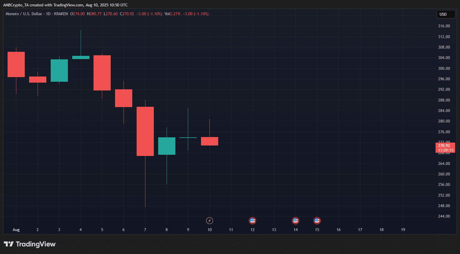 Since the start of August, Monero [XMR] has been on a steady downtrend, slipping from above $300 to $270.92. The decline accelerated between the 5-7 August, with consecutive red candles breaking key support levels. Brief relief came on 8 August, but follow-through buying failed to materialize, leaving the price action subdued.