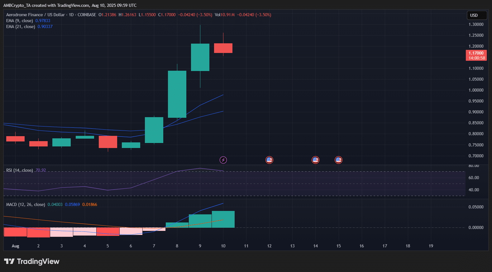 Aerodrome Finance [AERO] extended its breakout rally this week, surging from under $0.80 to highs above $1.25 before easing to $1.17.