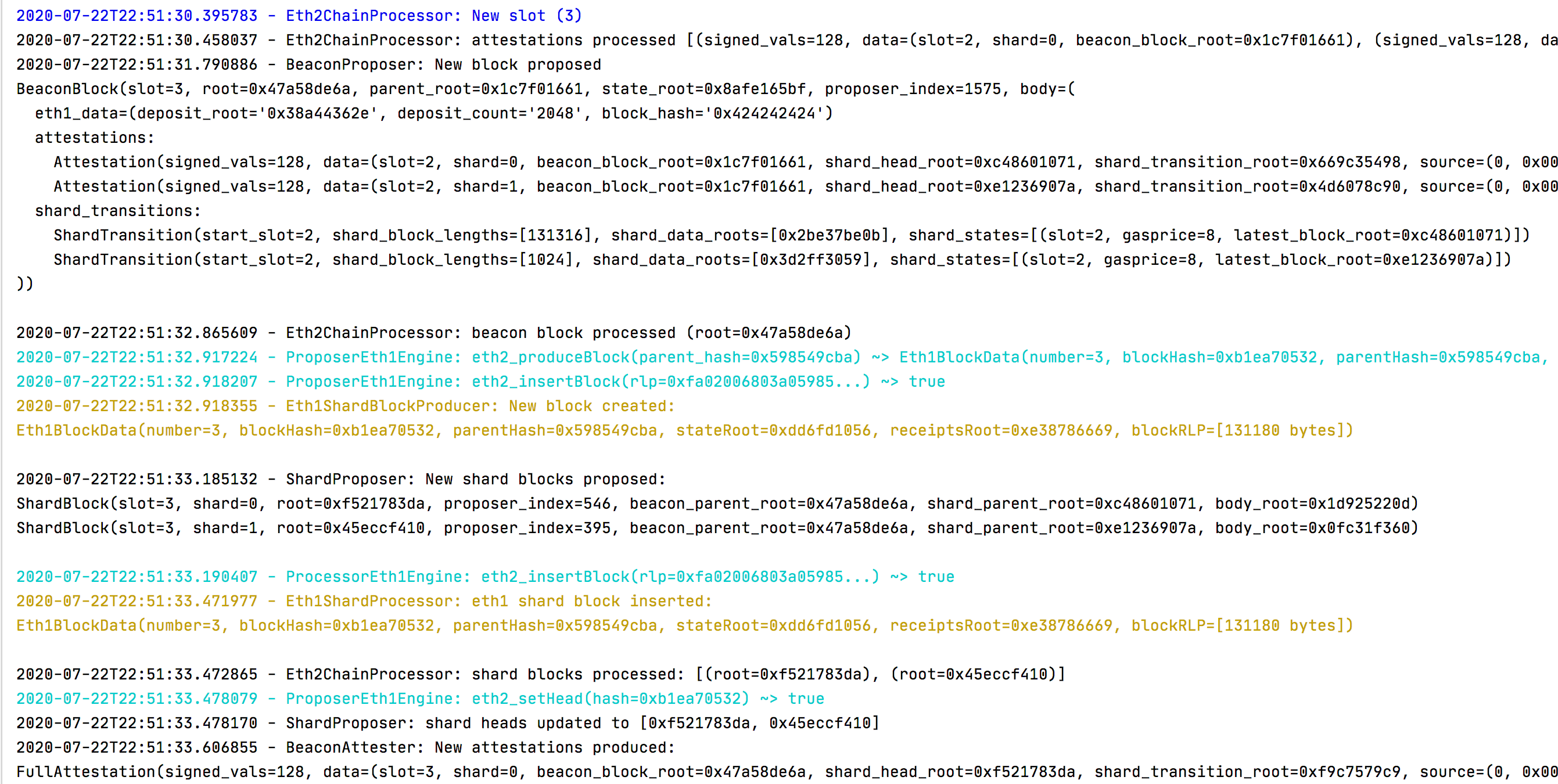 Since the above posts were written, Mikhail and Guillaume have been busy turning these concepts into reality. Guillaume’s Catalyst — a version of geth which defers its consensus to RPC calls (i.e. an eth2 client) — is built and ready to go; and Mikhail’s Phase 1 implementation is running fully sharded eth2 simulations with select shards deferring block production and validity calls to a local, stubbed eth1-engine.