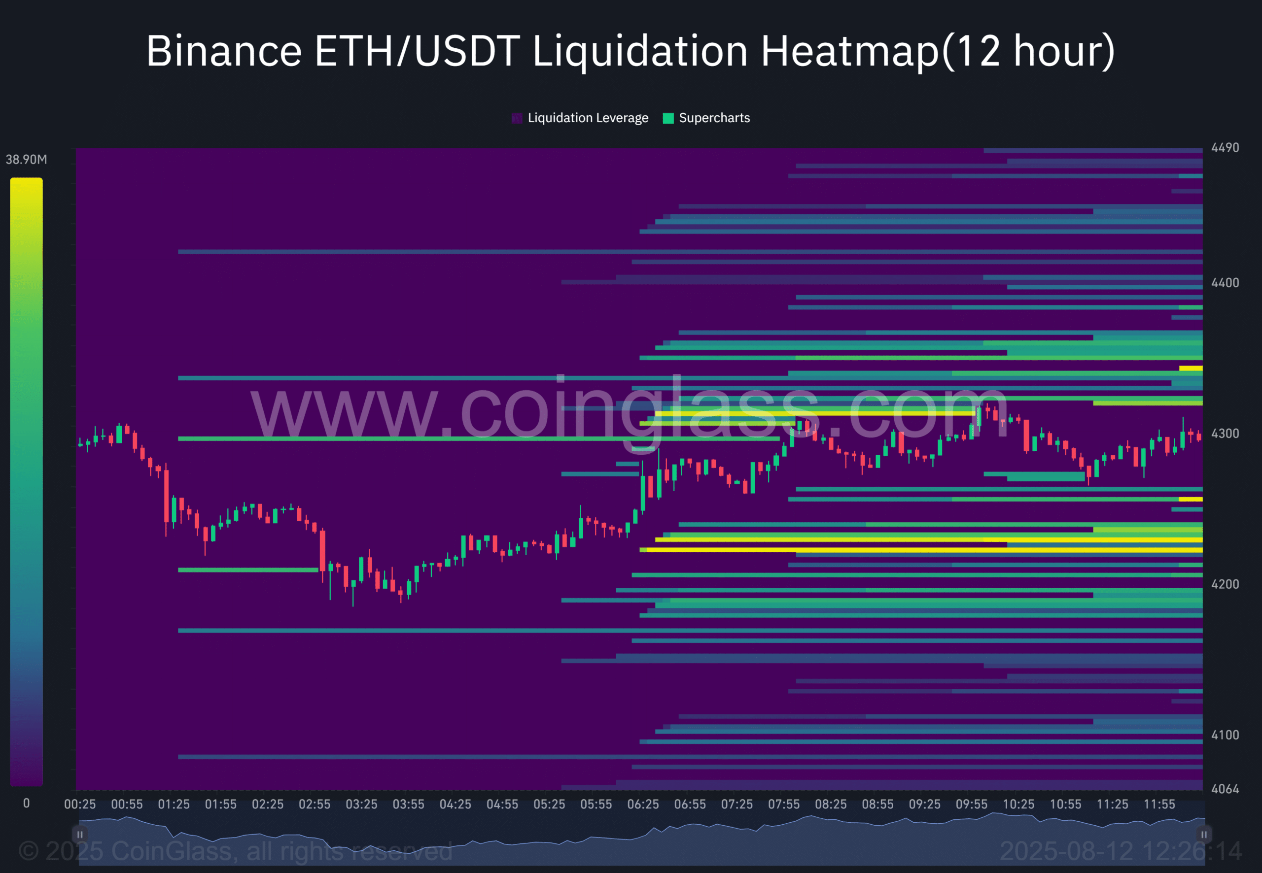 The result? A chunky liquidity zone at $4,344, with $36 million in short leverage stacked. Looks like opportunistic players are creeping back in, eyeing a potential local top.