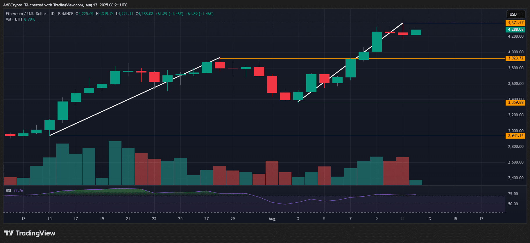 And yet, the key divergence lies in momentum. Unlike the late-July peak at $3,941, when Ethereum’s RSI surged above 80, its RSI at press time was holding near 70, suggesting the uptrend may continue without entering an exhaustion phase.