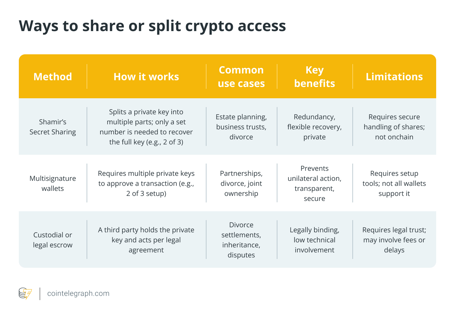 Crypto can be shared securely. Methods like Shamir’s Secret Sharing, multisignature wallets and custodial agreements allow safe, collaborative access and division.