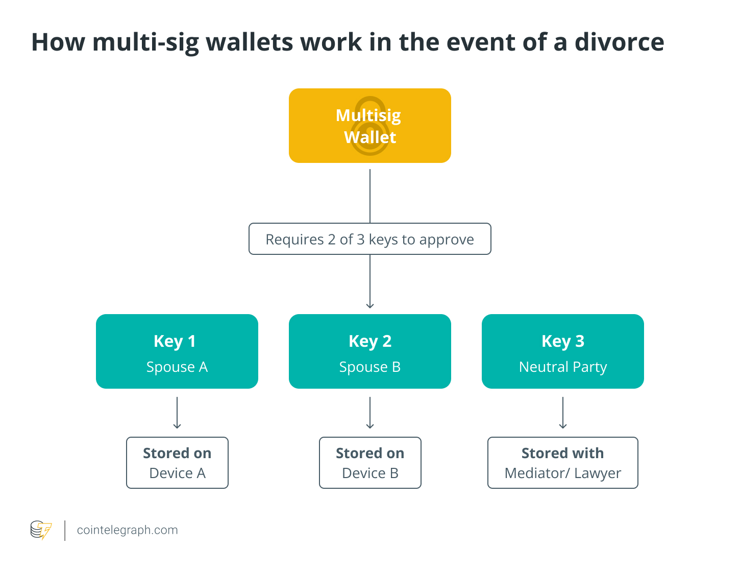 So if Key 1 goes to Spouse A, Key 2 goes to Spouse B, and Key 3 goes to a neutral third party (like a divorce attorney, mediator or escrow agent), a wallet requires two out of three signatures to approve a transaction.