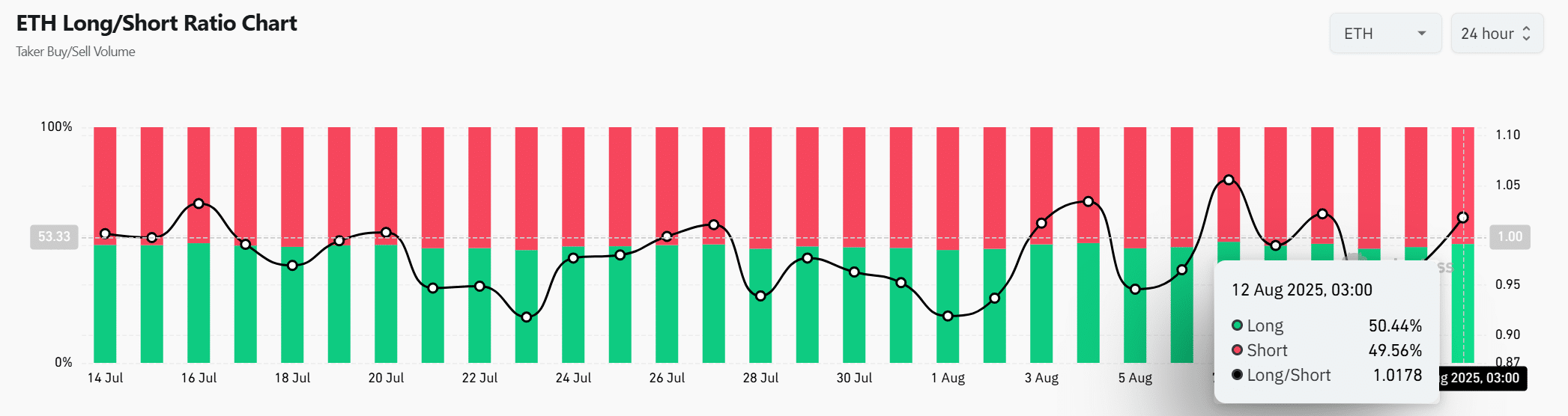 At the time of writing, the Long/Short Ratio sat almost evenly split – Longs at 50.44% and Shorts at 49.56%.