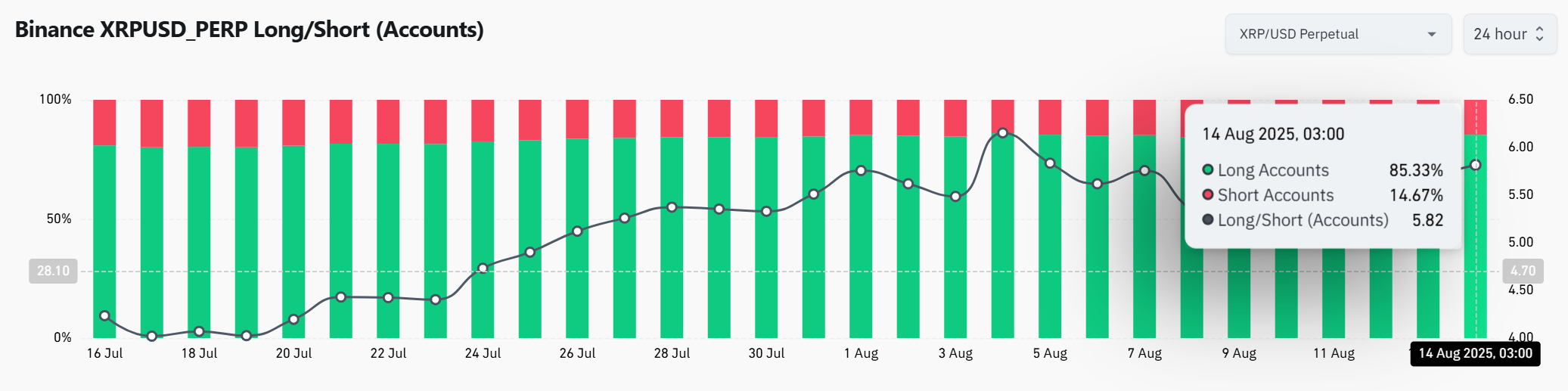 On Binance’s XRP perpetual market, long accounts make up 85.33% of open positions, while short accounts account for just 14.67%.