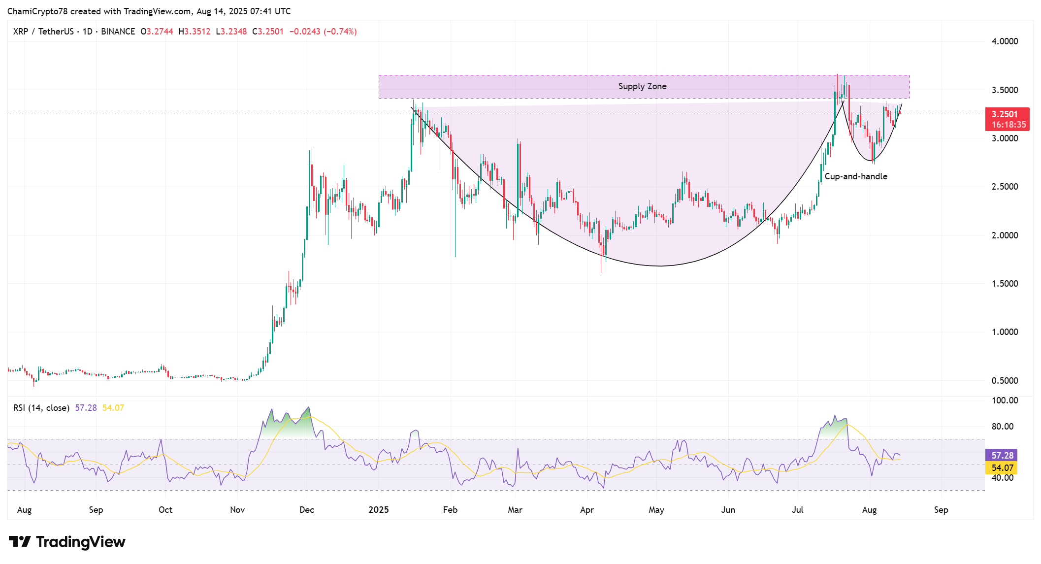 XRP’s daily chart shows a clearly defined cup-and-handle pattern forming near a critical supply zone between $3.35 and $3.50.