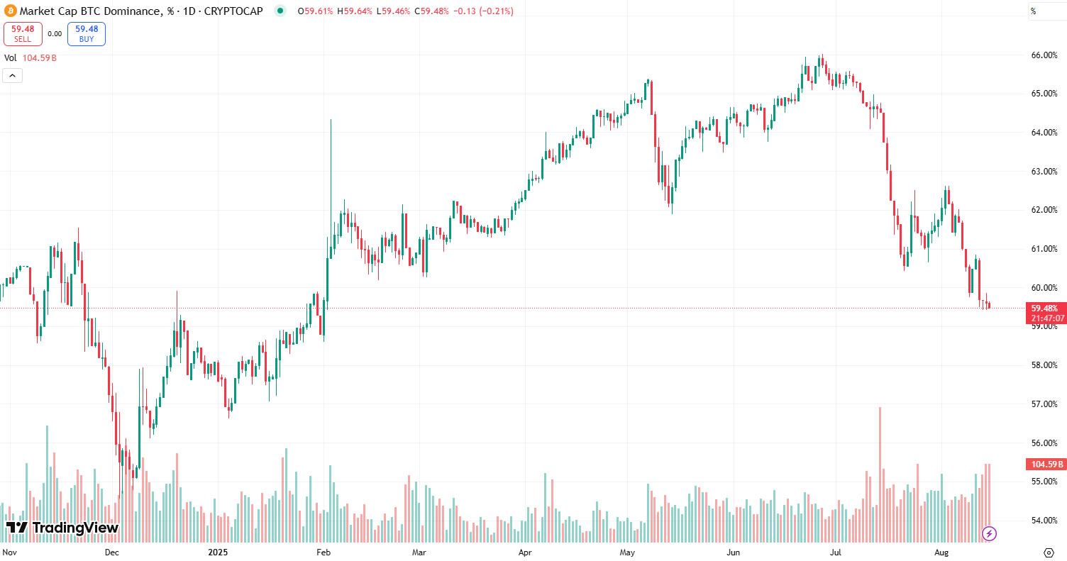 Bitcoin dominance is currently 59.5%, around its lowest level since late January, according to TradingView.