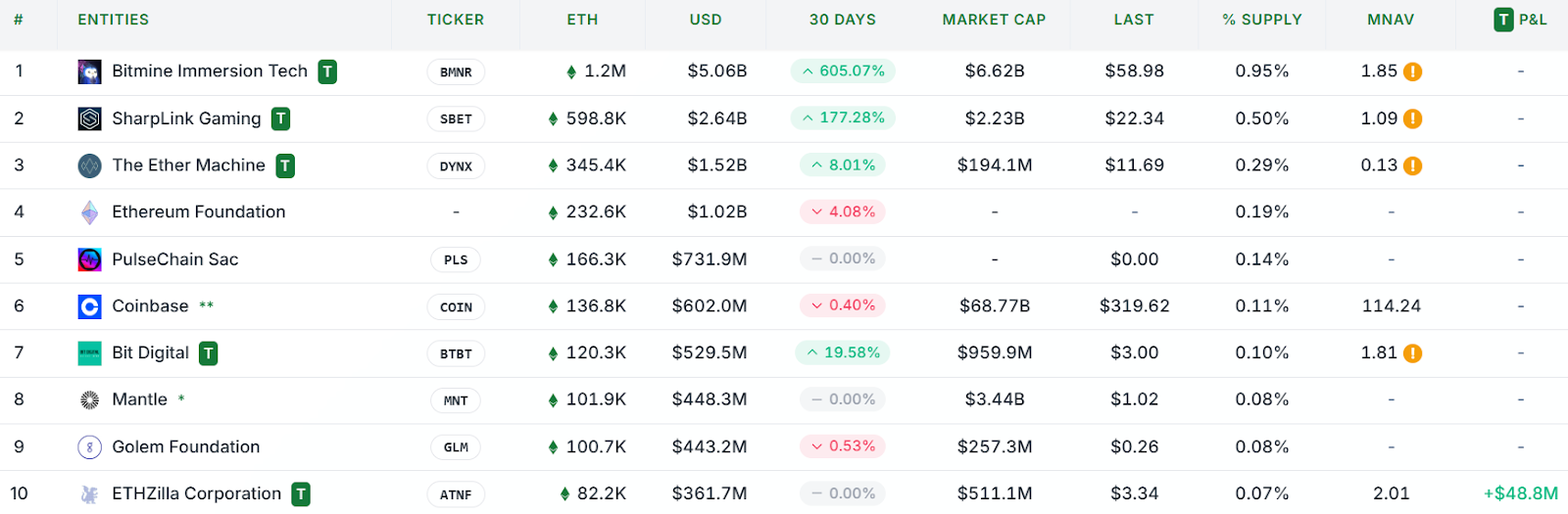 Bitmine is the world’s largest corporate holder of Ether with 1.2 billion ETH worth $5 billion on its books, followed by SharpLink with 598,000 Ether worth $2.64 billion, data from StrategicEthReserve shows.