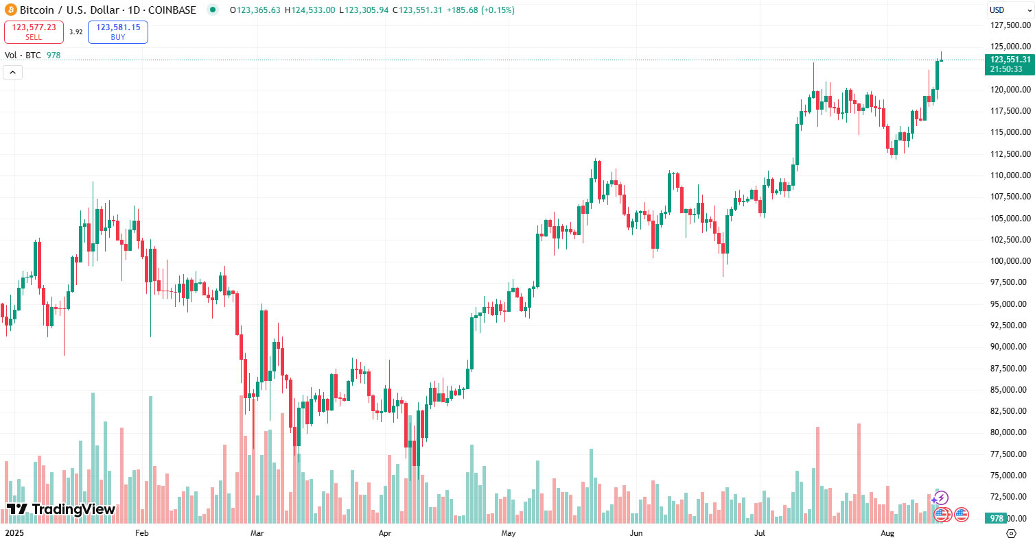 Bitcoin prices reached $124,500 on Coinbase in early trading on Thursday, according to TradingView. The move added 3.5% to the asset on the day and pushed total crypto market capitalization to a record high of $4.26 trillion.