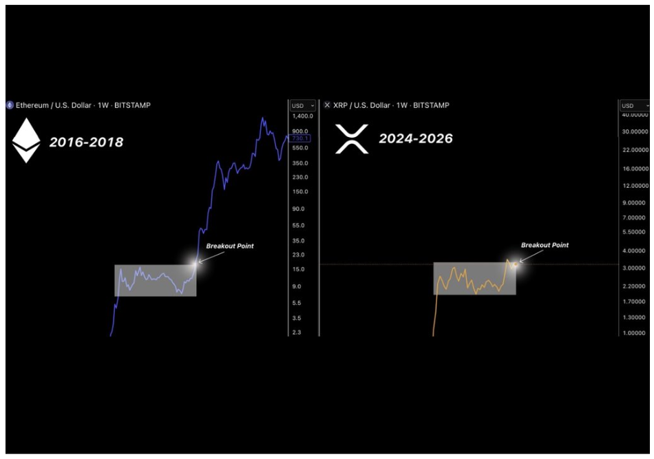 At the same time, XRP’s chart structure on the weekly candlestick timeframe shows that it may be approaching a breakout similar to Ethereum’s explosive run between 2016 and 2018.