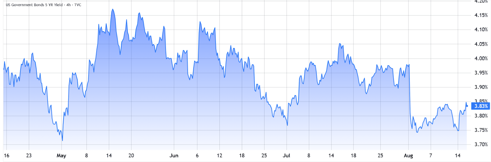 When recession fears rise, demand typically increases for assets backed by the US government, allowing investors to accept lower yields. After dropping to 3.74% on Aug. 4, the lowest level in more than three months, 5-year Treasury yields rebounded to 3.83% on Friday. The move indicates traders are becoming less risk-averse, opening space for a rebound in altcoin market capitalization.