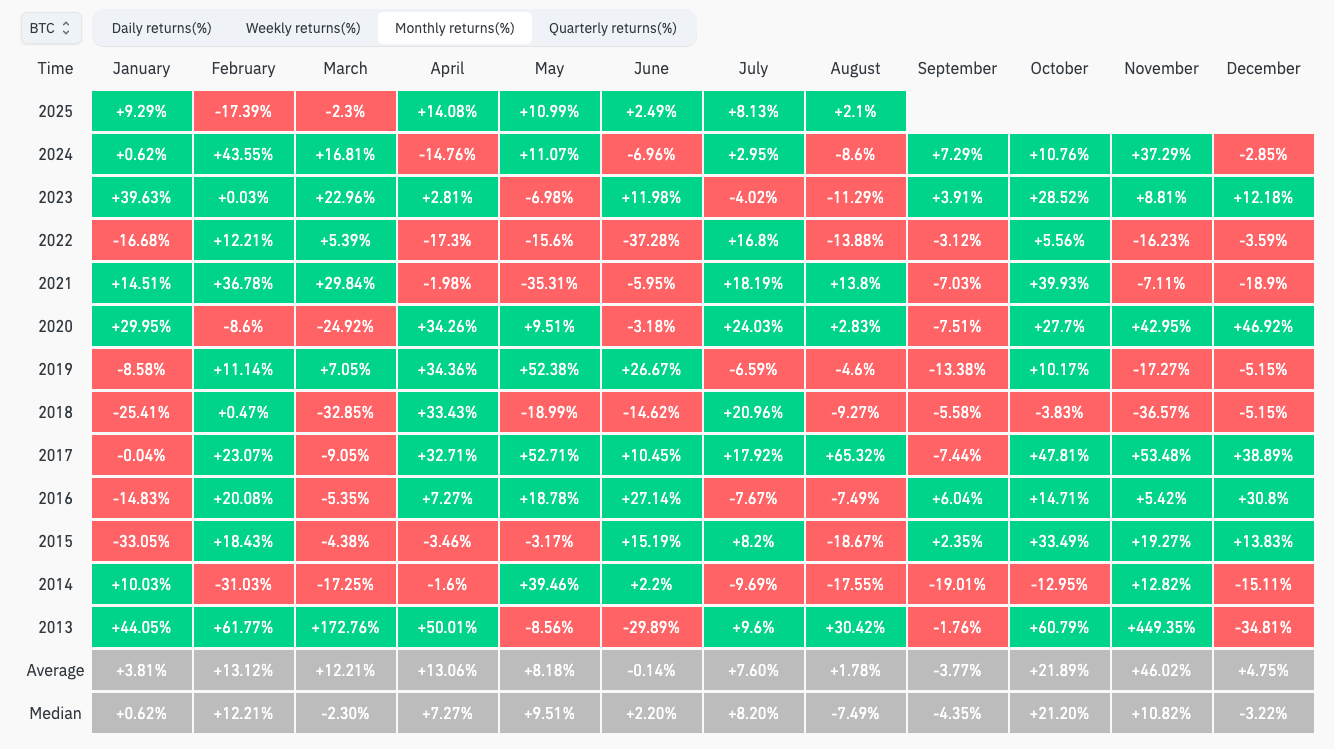 Data from monitoring resource CoinGlass shows BTC/USD up 2.1% in August, already slightly above the 1.8% average. September, by contrast, has on average delivered a 3.8% price drawdown.