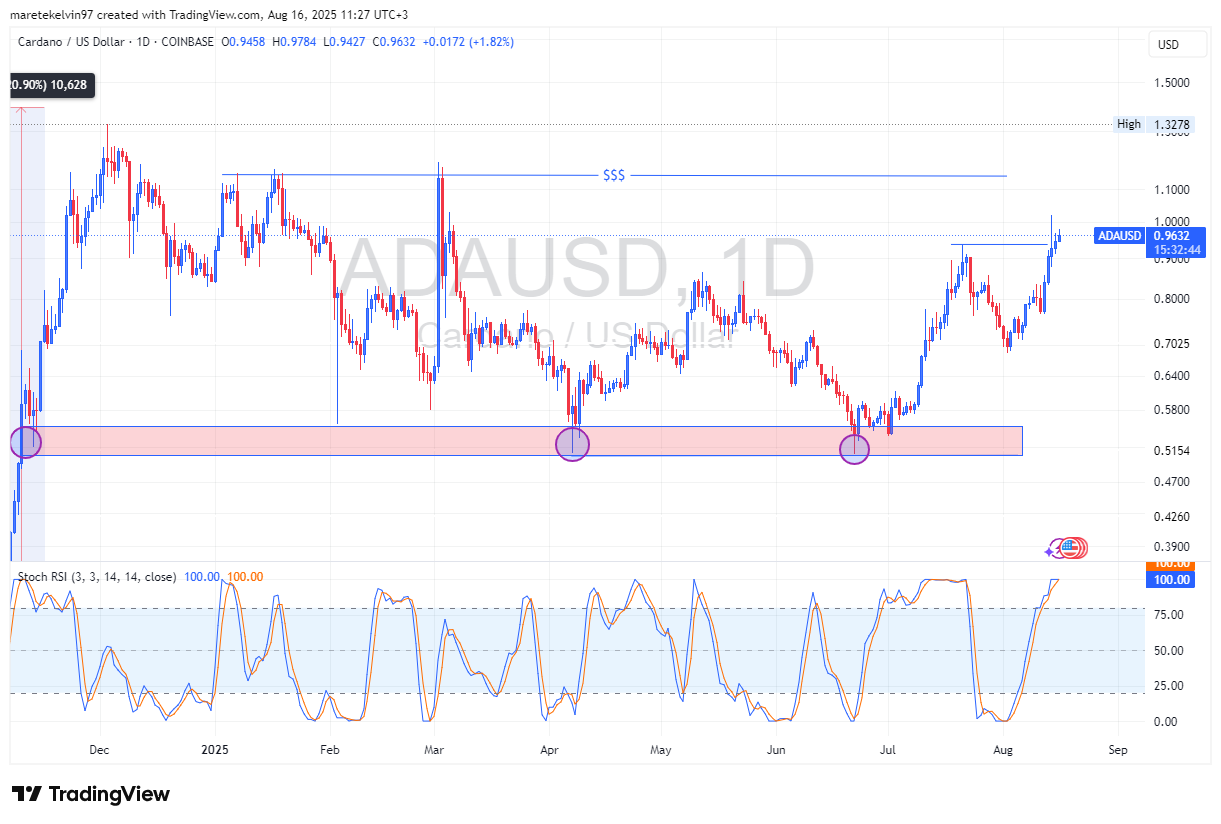Cardano broke above the $0.9382 resistance level on the daily chart, a move that gives its structure a more constructive bullish outlook compared to its peers.
