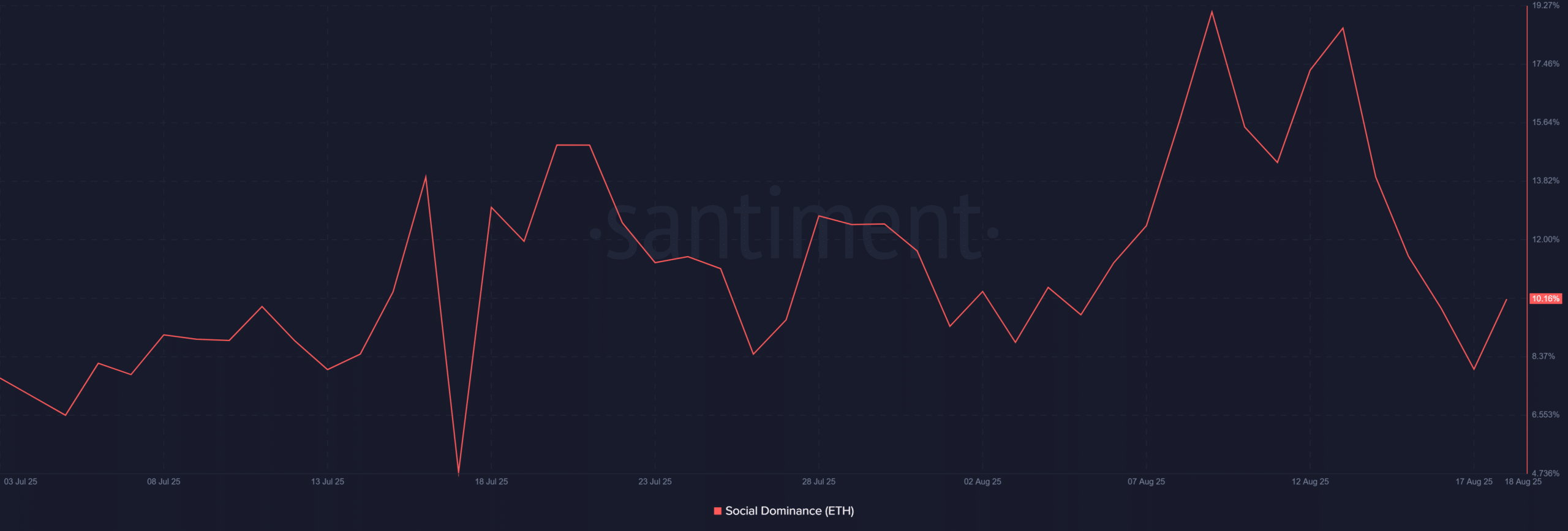 Ethereum’s Social Dominance has climbed to 10.16%, with earlier spikes exceeding 17% in recent weeks.