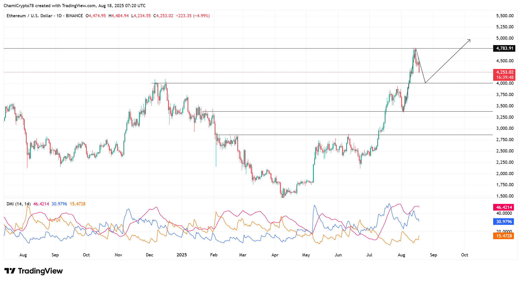 At press time, Ethereum was trading around $4,253 after a 6% intraday drop, showing signs of cooling following its recent rally to $4,783.
