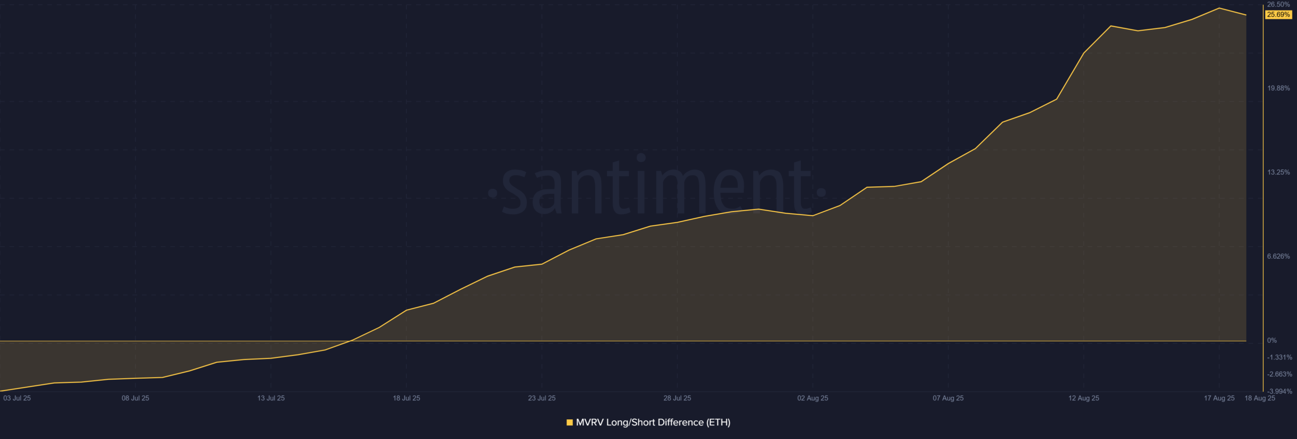 The MVRV Long/Short difference for ETH has risen steadily to 25.69%. Thus, long-term holders are realizing far higher profits compared to short-term participants.