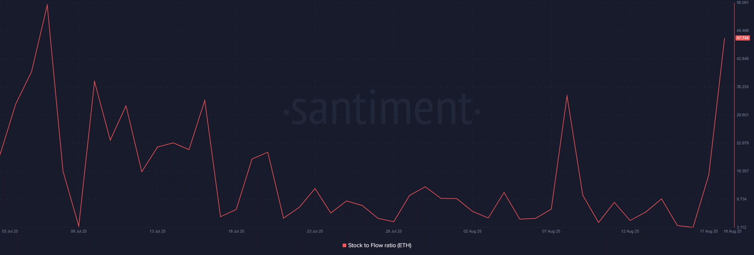Ethereum’s Stock-to-Flow ratio has climbed sharply to 47.7, marking one of its highest readings in months.