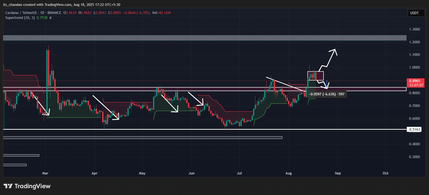 If ADA closes a daily candle below the $0.90 level, there is a strong possibility of a decline of over 6.65%, with the price potentially dropping to $0.835.