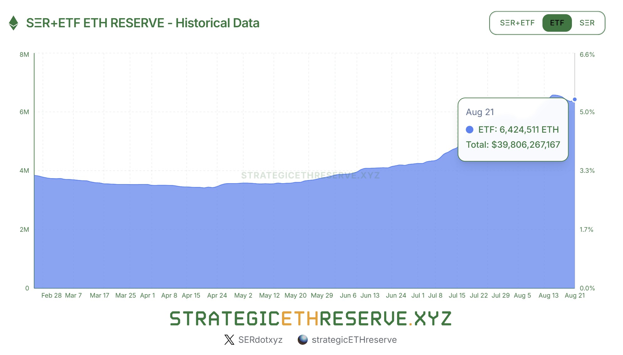 Data from CryptoQuant shows that ETH custodial holdings within ETFs reached 6.42 million ETH on Aug. 21, up from 4.15 million ETH on July 8, representing a cumulative increase of 2.27 million ETH in just six weeks. This represents roughly 58% growth over the period, marking one of the most aggressive accumulation phases since ETH ETFs went live.