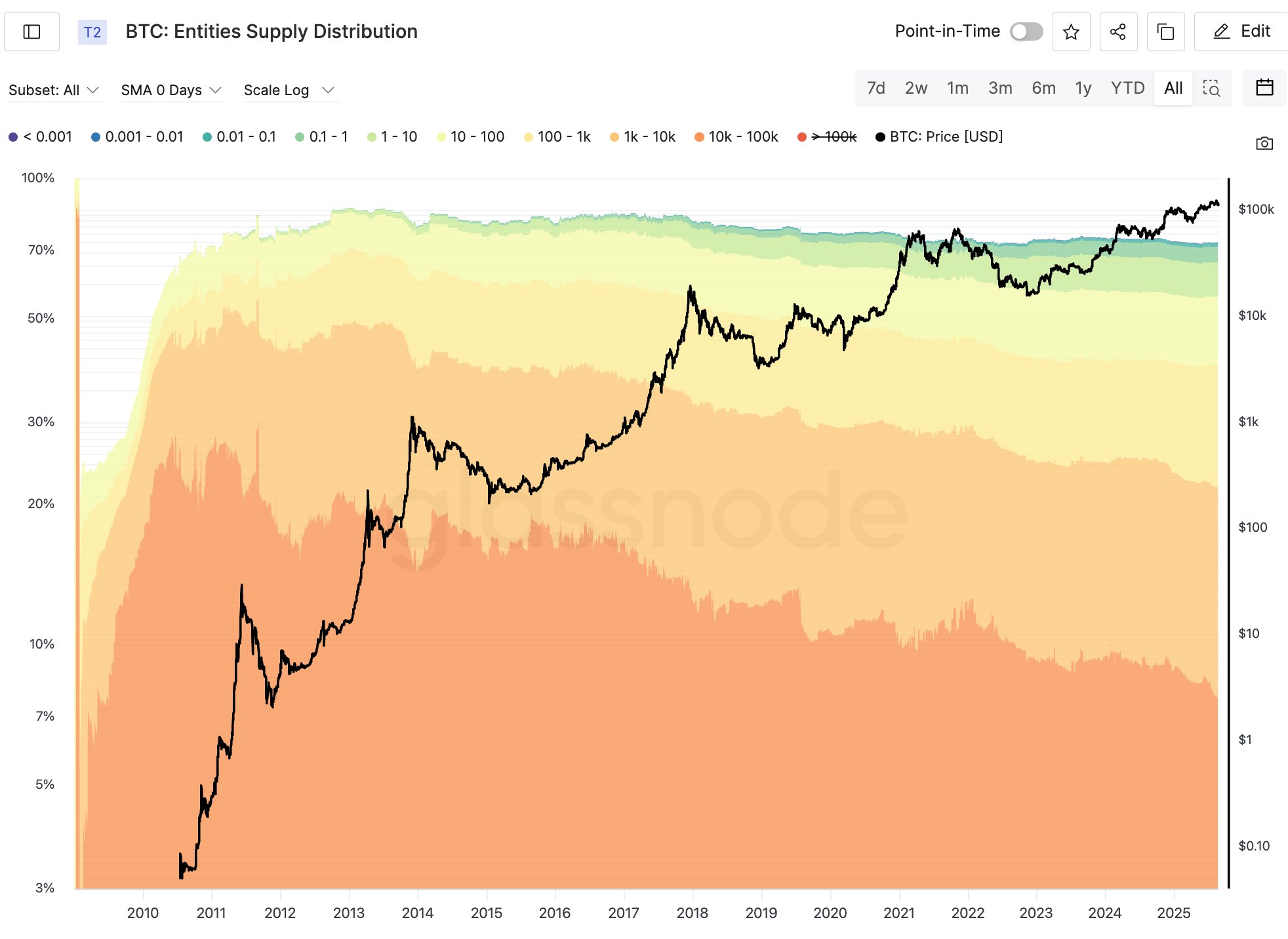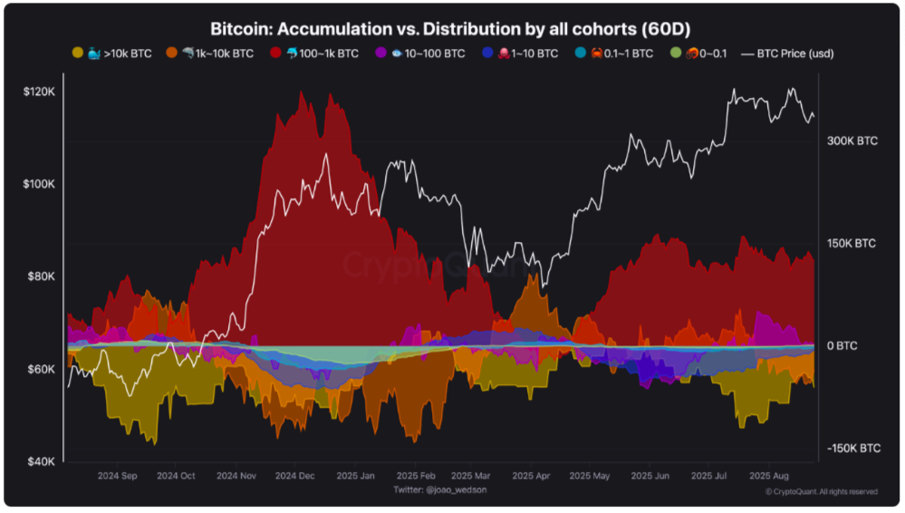 Conversely, those between 10 and 100 BTC display distribution behavior, having shifted to profit-taking en masse as the price hit $118,000.