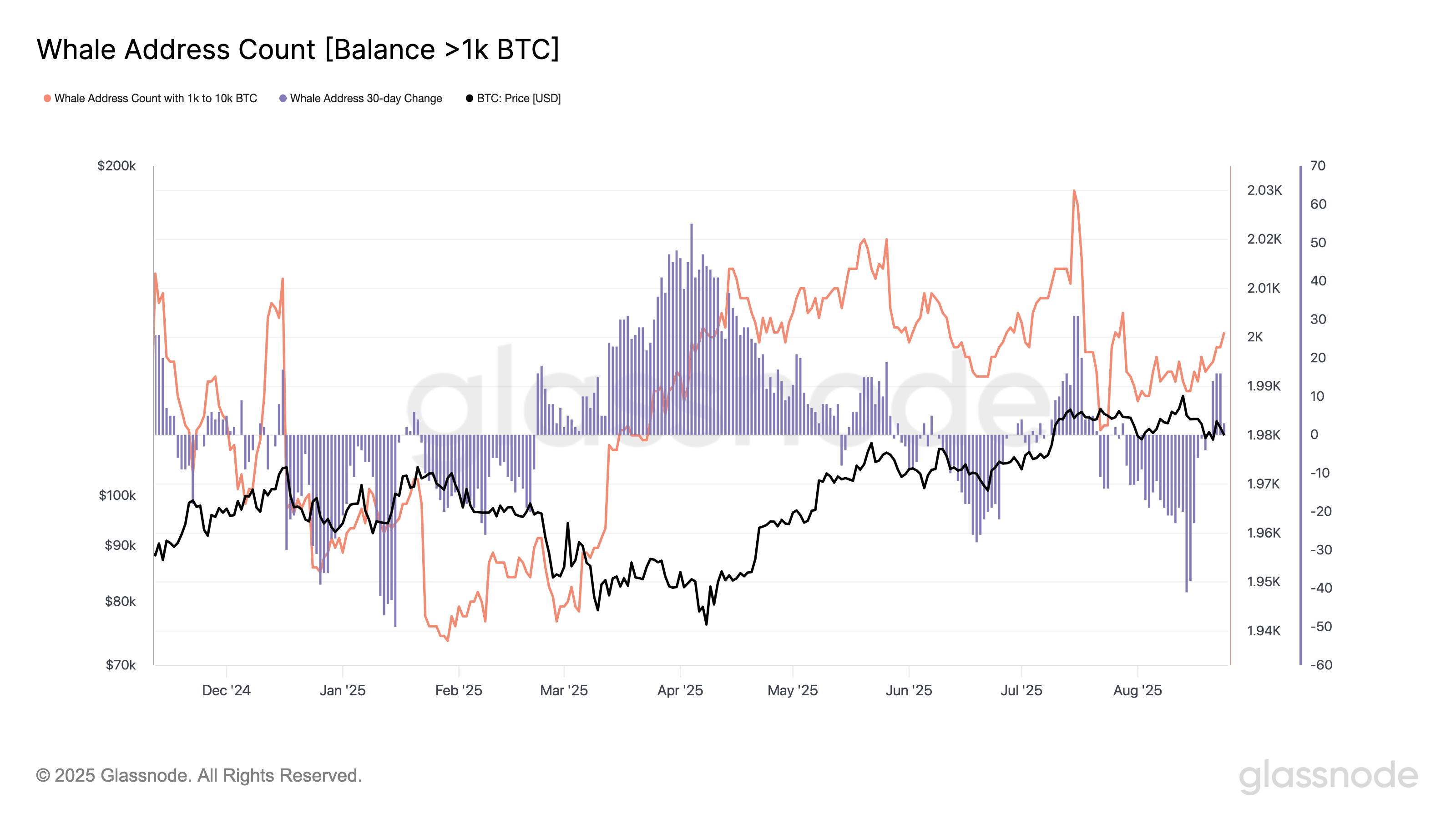 Data from onchain analytics firm Glassnode confirms that as of Sunday, there were 2,000 addresses with a balance of between 1,000 and 10,000 BTC — corresponding to all but the largest “mega” whales. This marked a new August high.