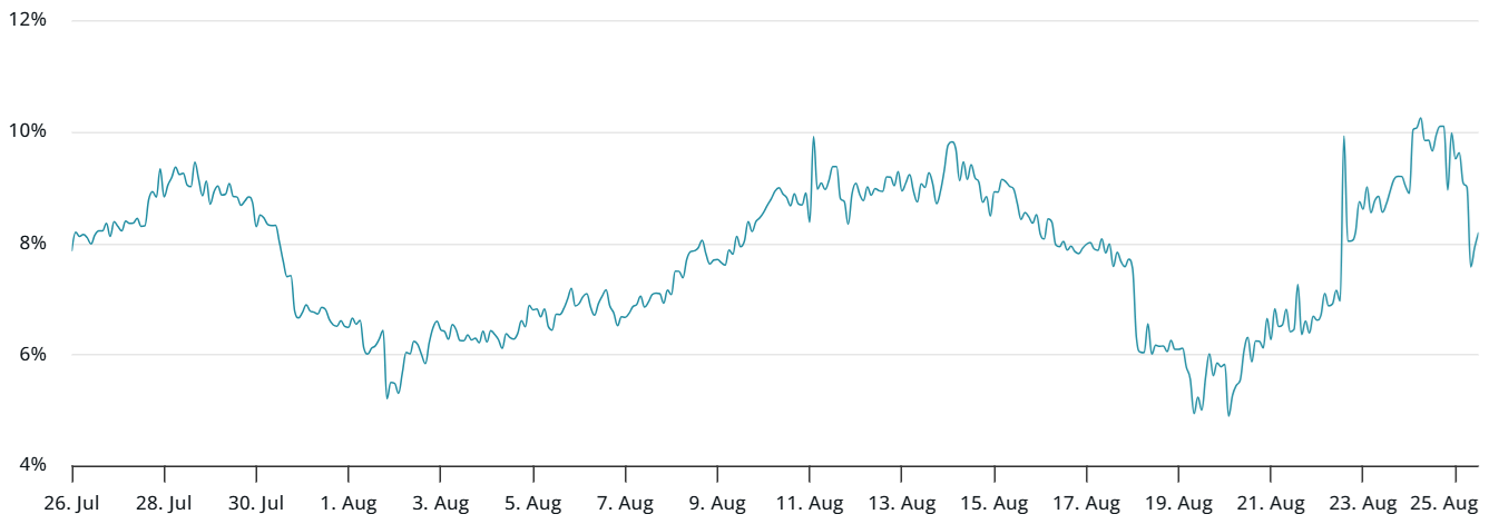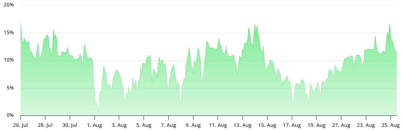 The Bitcoin perpetual futures funding rate dropped back to 11% after a short-lived uptick. In neutral markets, the rate usually ranges between 8% and 12%. Some of the muted sentiment can be explained by $1.2 billion in net outflows from US-listed spot Bitcoin ETFs between Aug. 15 and Aug. 22.