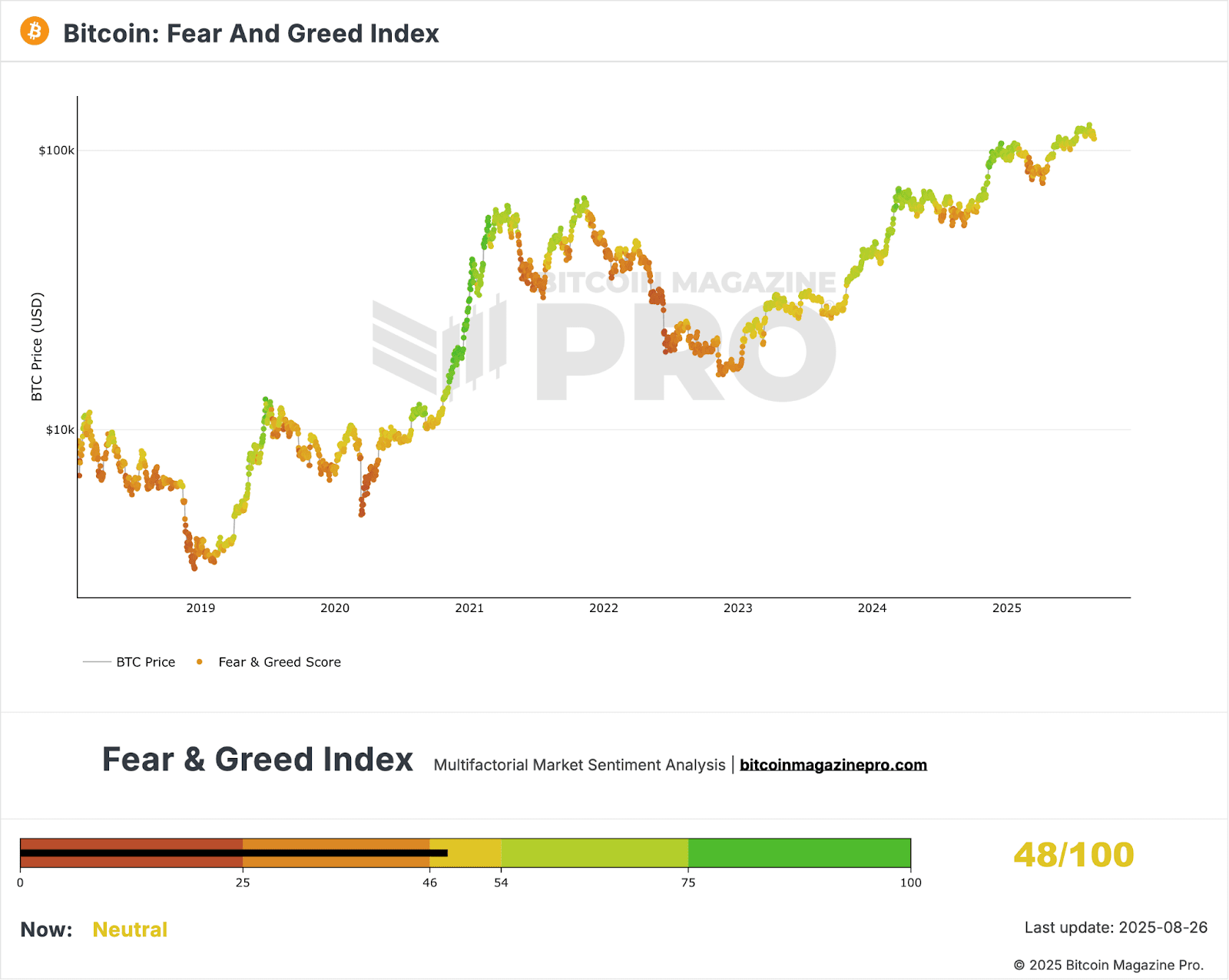 Bitcoin Magazine Pro explains that the Index helps investors separate their emotions from broader market reactions, offering insights into when assets may be overbought or oversold. Scores near zero reflect “extreme fear,” while scores close to 100 represent “extreme greed.” With Bitcoin currently at 48, sentiment is edging toward concern but has not yet fully entered bearish territory.