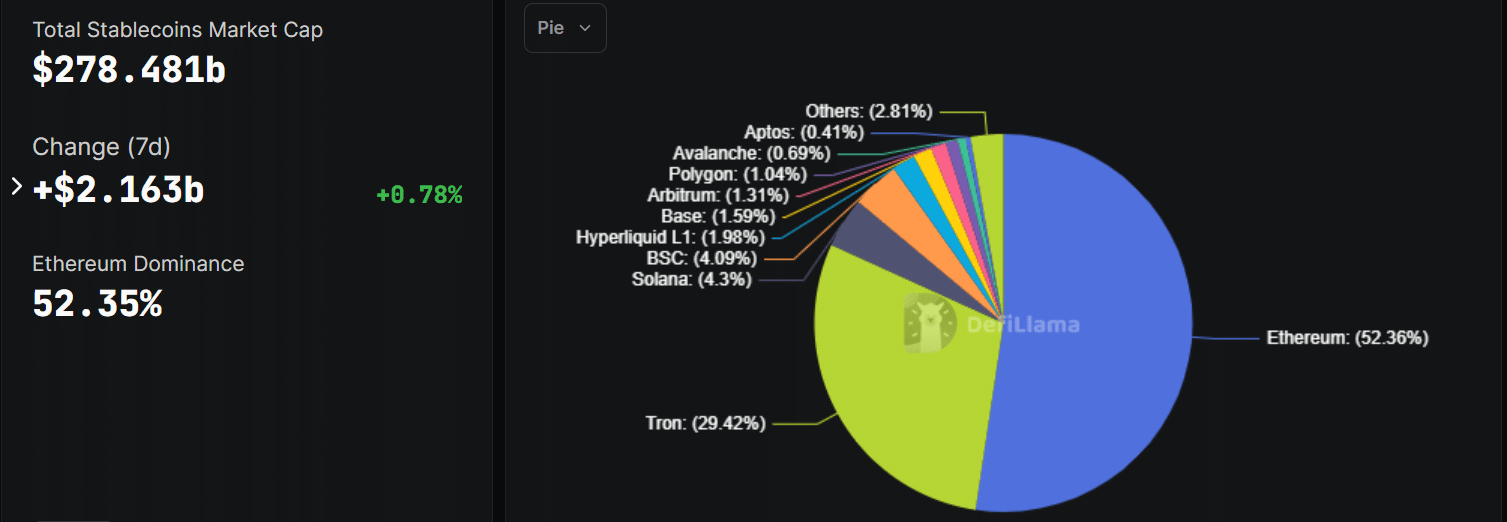 As of August 2025, Ethereum controlled over 52% of total stablecoin settlements worth over $145 billion, according to DeFiLlama data.