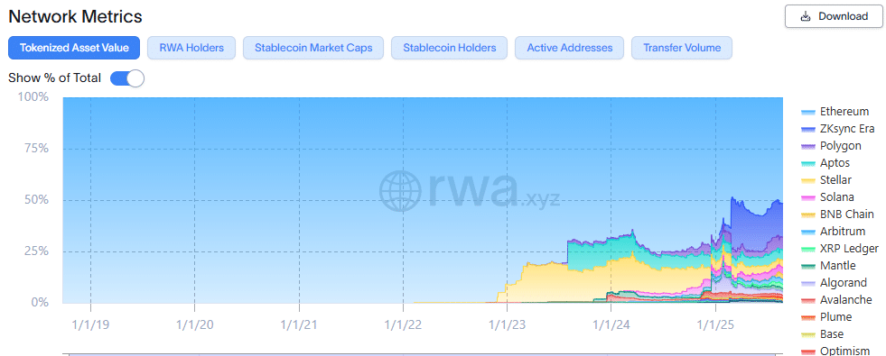 As of 2025, Ethereum also dominated the tokenized market with a 52% share or over $7B, according to RWA data.