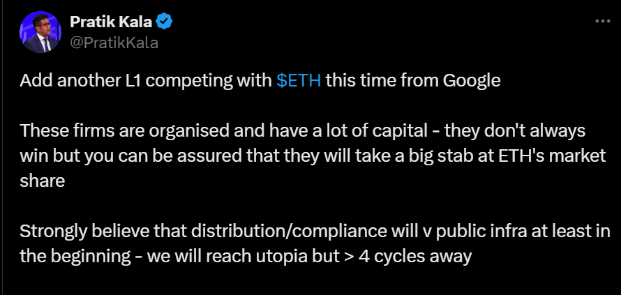 However, Chuk Okpalugo, the product manager at Paxos, downplayed Google’s impact on Ethereum, stating that the new chain will be ‘permissioned’ and anti-stablecoin.