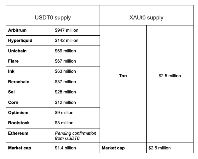 USDT0 and XAUt0 supply and market capitalization as of Wednesday. Source: USDT0, CoinGecko