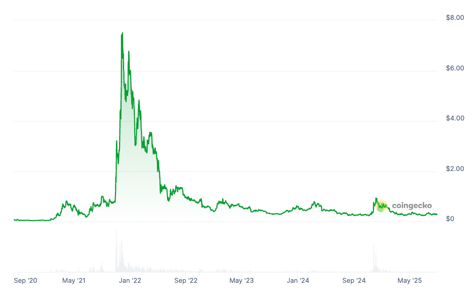 According to CoinGecko data, SAND traded at $0.28 by publishing time, down nearly 97% from the all-time high levels of $8.4 recorded in November 2021.