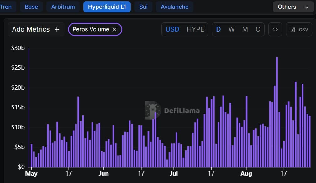 According to Defillama data, Hyperliquid’s Perpetuals Volume has declined for four consecutive days, dropping from $21 billion to $13 billion.