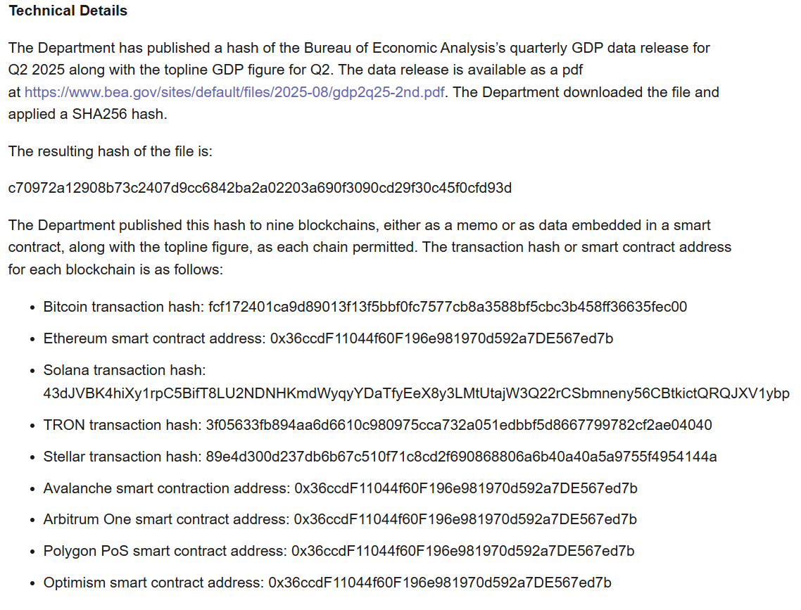 Starting with the data from July 2025, the GDP reports will be published on nine public blockchain networks, including Bitcoin, Ethereum, Avalanche, Solana, Tron, Stella, Arbitrum One, Polygon PoS and Optimism, wrote the Department in a Thursday announcement, adding:
