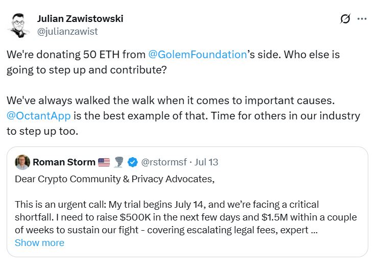So far, a free Roman Storm defense fund has raised over $5 million. Source: Roman Storm Defense Fund