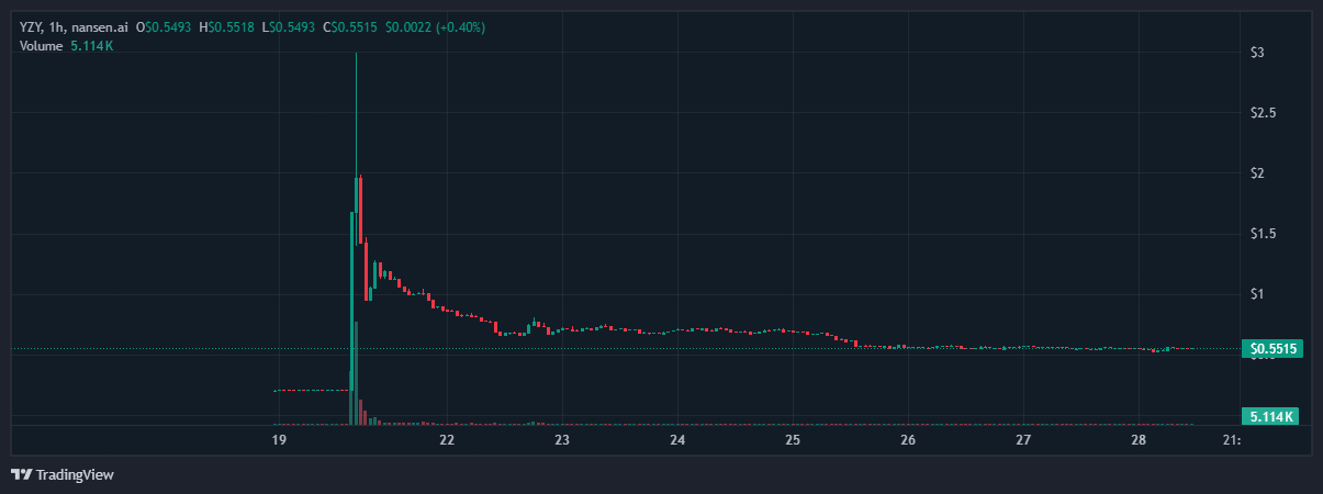 Meanwhile, the YZY token’s price is down over 80% from its all-time high, trading at $0.5515 with just 19,531 traders holding the token, data from blockchain intelligence platform Nansen shows.