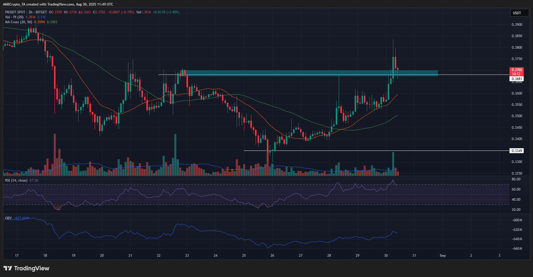 Naturally, this breakout aligned with strong RSI readings. On top of that, the OBV trended higher over the past four days, reflecting steady buying pressure since the $0.335 low on Monday, the 25th of August.