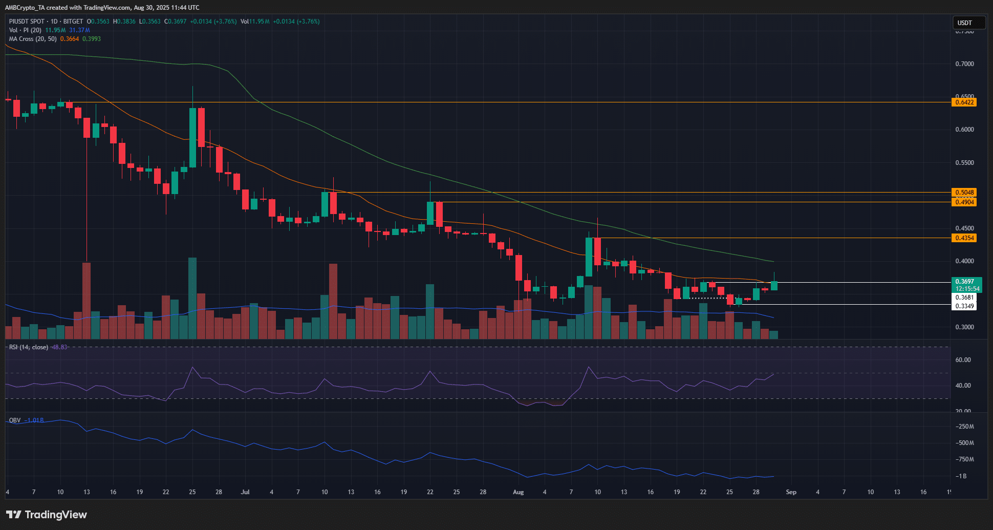 However, past price action urged caution. In early August, PI’s RSI also climbed past 50 before the token rallied to $0.435. And within 16 days, bulls lost 23%.