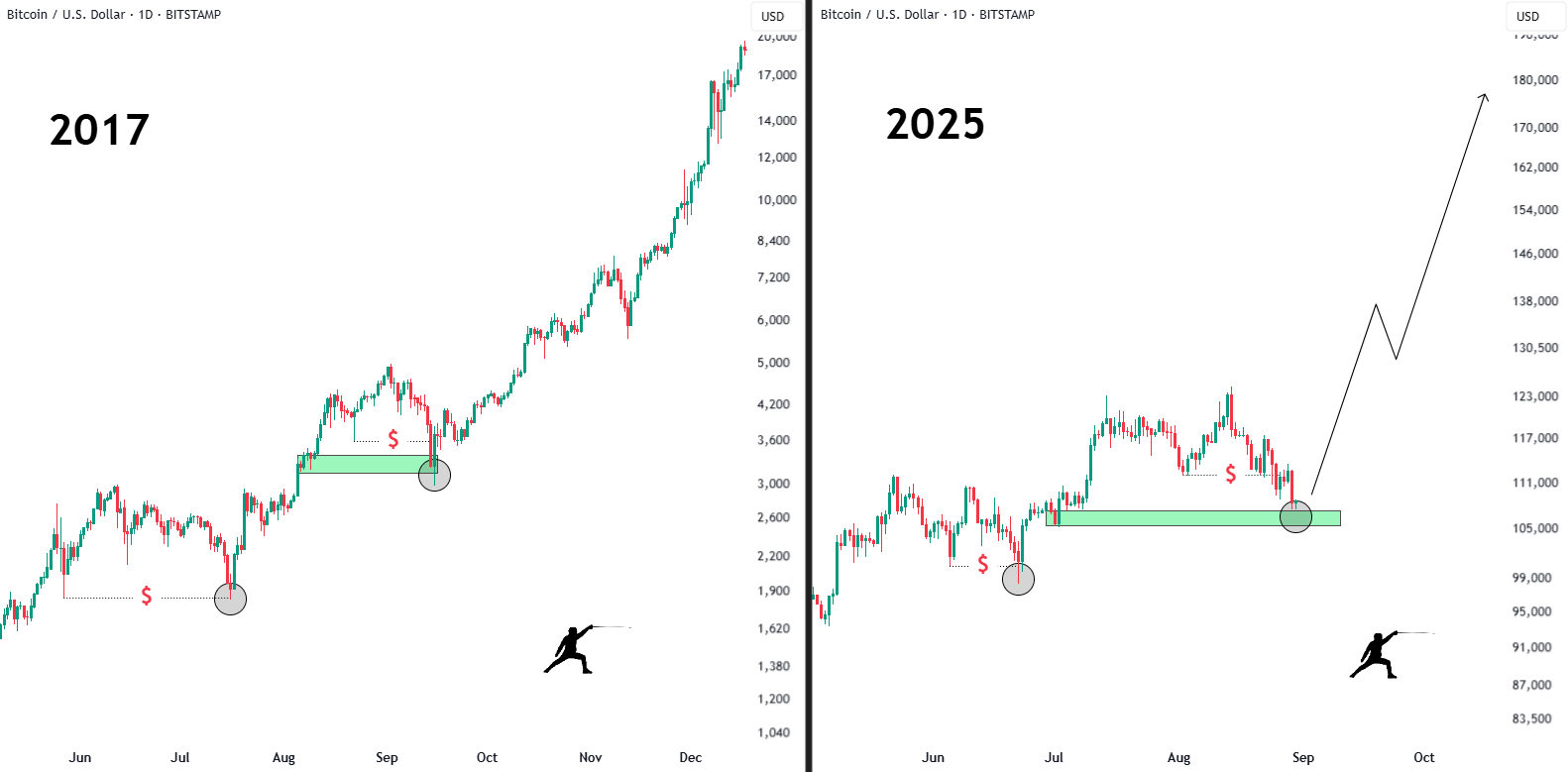 The chart overlay of 2017 and 2025 reveals a near-mirror image. In both cycles, Bitcoin slipped sharply in late August, found footing at a key support zone, and then reversed higher.