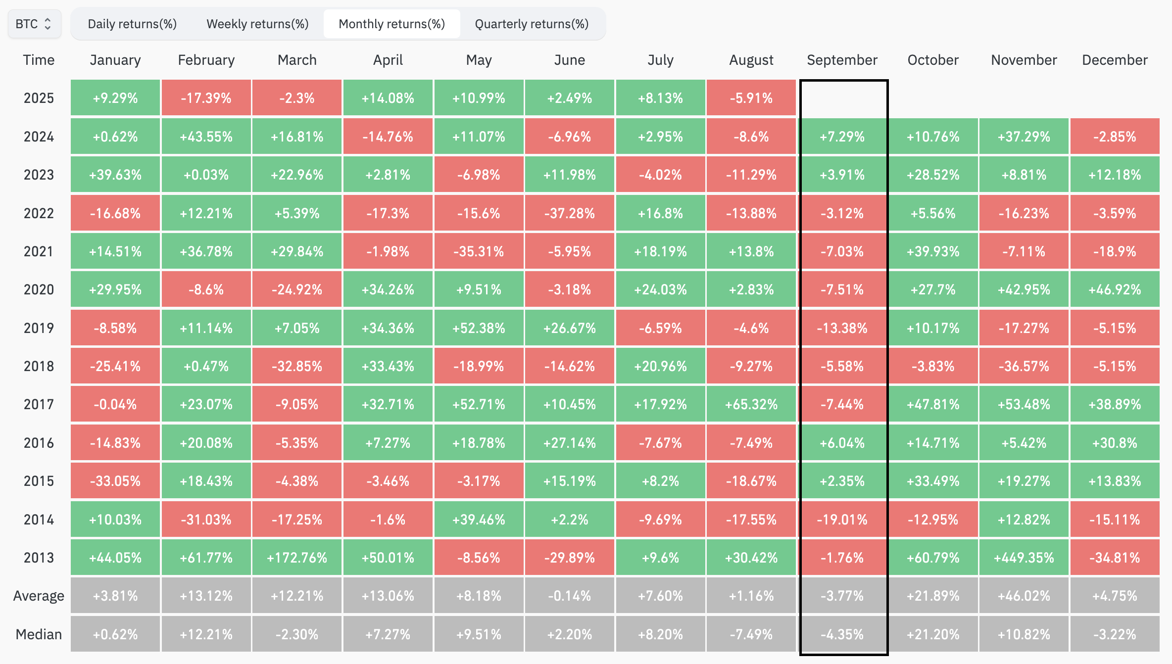 Since 2013, Bitcoin has closed in the red for eight of the past twelve months, with average returns slipping about −3.80%.
